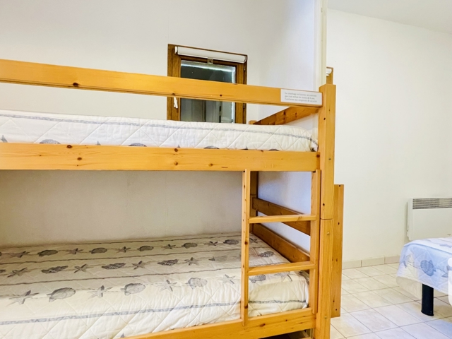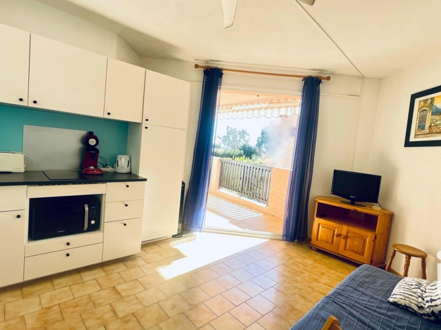 iad France - Fanny Giraud vous propose: Au sein d'une copropriété prisée, à quelques pas des plages et du port de La Londe Les Maures, bel appartement lumineux de type 2 avec vue MER, d'environ 29 m ². Il se compose d'une chambre, d'un espace lits superposés, d'une salle d'eau avec toilettes, d'une cuisine rénovée ouverte sur le séjour donnant sur la terrasse par de grandes portes à galandages.