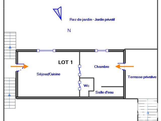 Deux escaliers mènent à l'appartement depuis la place de parking privative située en contre-haut, accédant distinctement au séjour ou à la chambre.