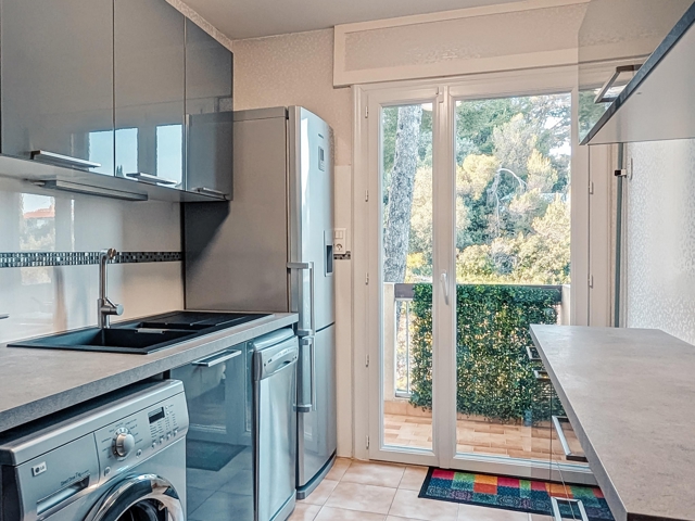 La cuisine, entièrement aménagée et équipée, bénéficie d’un accès à un balcon côté nord avec loggia, offrant un espace de rangement supplémentaire. Elle comprend une hotte aspirante, une plaque vitrocéramique Rosières, un four Smeg, un lave-vaisselle, un lave-linge et un réfrigérateur, le tout en très bon état de fonctionnement.