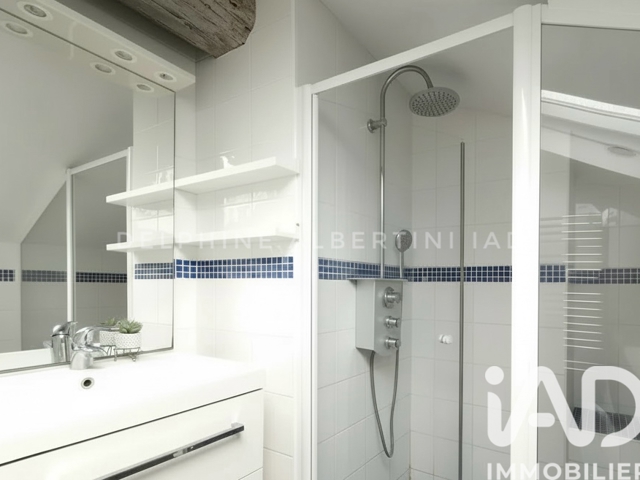 Un escalier mène à l’étage supérieur aménagé sous les mansardes, offrant une atmosphère chaleureuse et pleine de charme. La seconde chambre bénéficie d’une lumière naturelle généreuse grâce à ses ouvertures en toiture et dispose de rangements parfaitement intégrés. Une salle d’eau avec WC complète ce niveau.