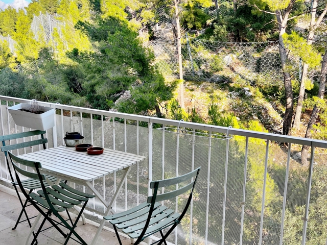 L'espace de vie principal, comprend une grande cuisine moderne, meublée et équipée et un double salon donnant sur un large balcon sans vis à vis . Cet espace est idéal pour profiter des douces soirées méditerranéennes et pour prendre vos repas en toute tranquillité.