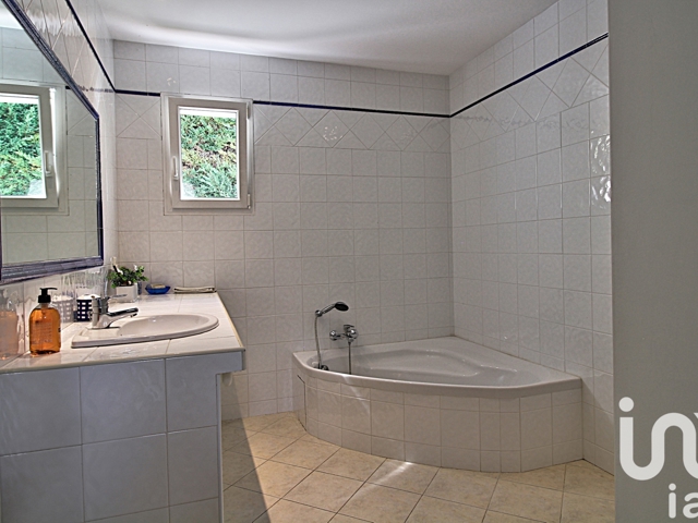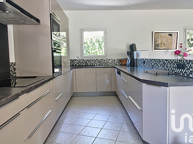 La maison dispose en outre d’un grand garage avec espace de rangement, buanderie et local technique pour la piscine. Le terrain, entièrement clos et paysagé, renforce la sensation d’intimité et de confort.