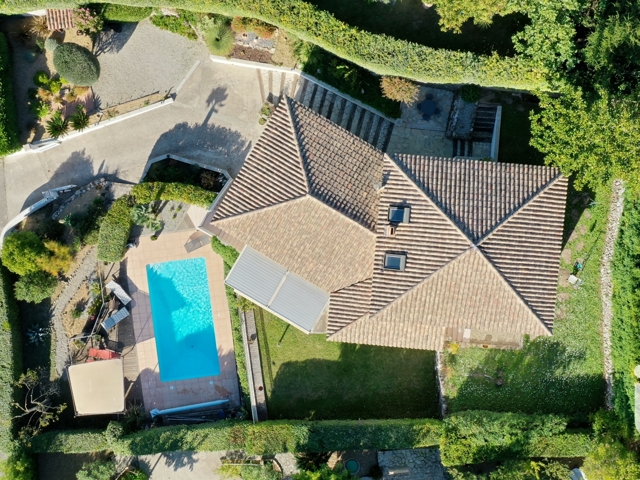 La maison dispose en outre d’un grand garage avec espace de rangement, buanderie et local technique pour la piscine. Le terrain, entièrement clos et paysagé, renforce la sensation d’intimité et de confort.
