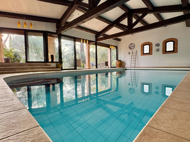 Un remarquable espace bien-être d’environ 115 m² accueille une piscine intérieure de 10 x 5 m, équipée d’un système de nage à contre-courant, chauffée par pompe à chaleur, et accompagnée d’un sauna à pierres chaudes.