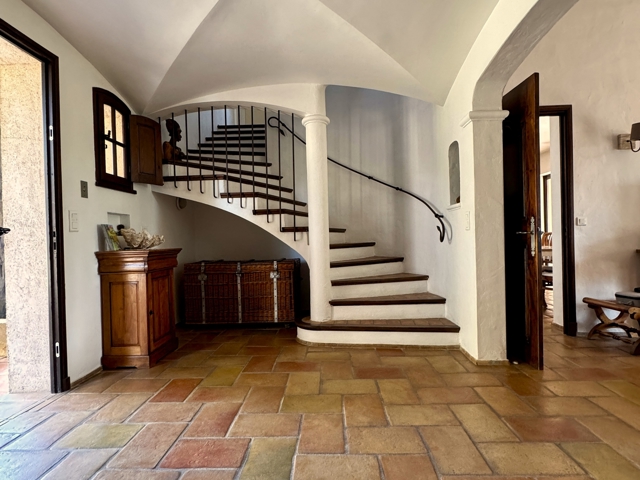 L’entrée dévoile un remarquable plafond en diamant, apportant caractère et élégance à cet espace d’accueil, sublimé par un escalier agrémenté d’une rampe en fer forgé façonnée à la main.