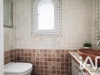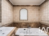 La salle de bains, élégante et intemporelle, habillée de pierre naturelle, dispose d’une baignoire balnéo, d’une douche et d’une double vasque. Un WC indépendant complète cet espace.