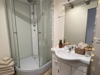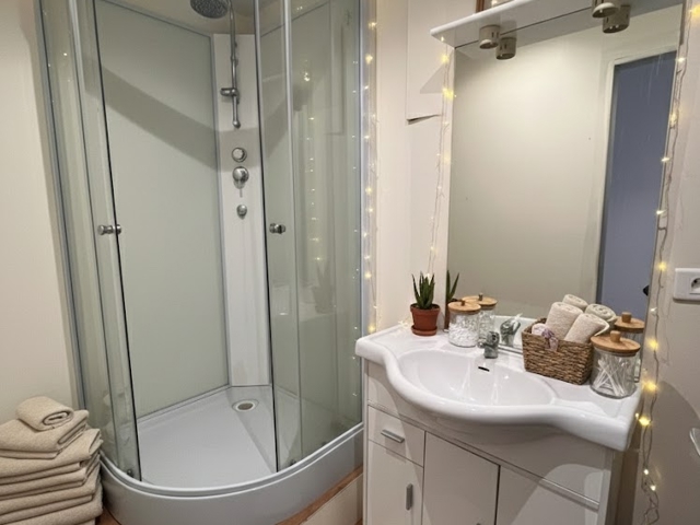 Au premier étage, un séjour climatisé, une salle d’eau et une chambre aveugle parfaite pour un bureau, un dressing ou une chambre d’appoint.