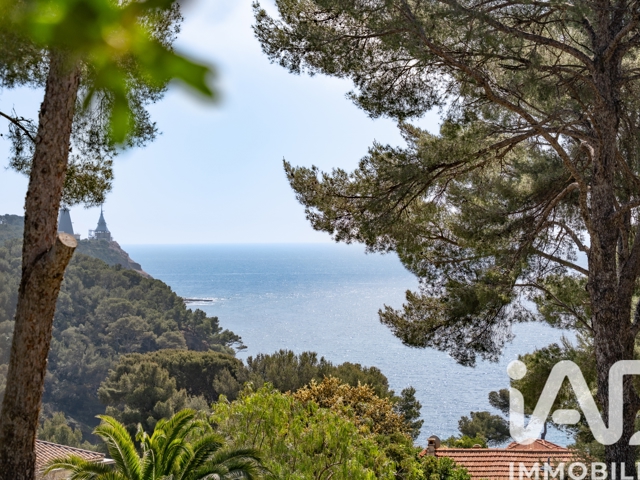 Elle est implantée sur un terrain arboré de 580 m² en restanques, la propriété développe environ 156 m² habitables et bénéficie d'une vue mer à travers les pins.