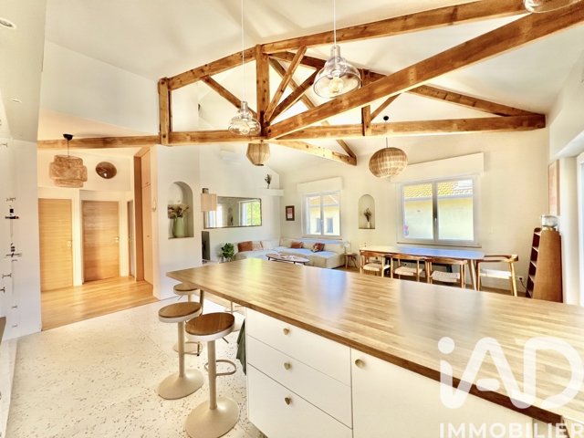 La pièce de vie, chaleureuse et élégante, est mise en valeur par une charpente apparente qui apporte caractère et authenticité. La cuisine, contemporaine et fonctionnelle, s’intègre naturellement à cet espace pensé pour recevoir et partager.