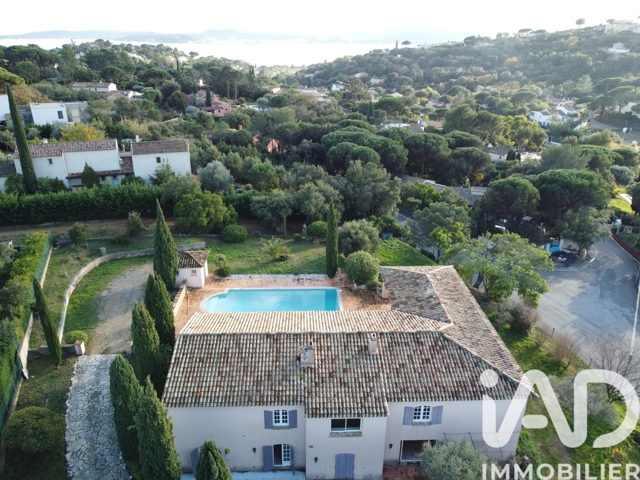 iad France - Laurent Ferriere vous propose: Dans un domaine privé, sécurisé et très recherché de Sainte-Maxime, au calme absolu et à seulement 1 km des plages et 2 km du centre-ville, découvrez cette maison de caractère d’environ 400 m² implantée sur un terrain paysager de plus de 3000 m² avec piscine.