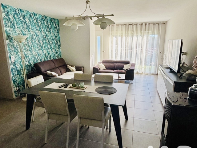 -Séjour lumineux avec cuisine ouverte, offrant un espace convivial