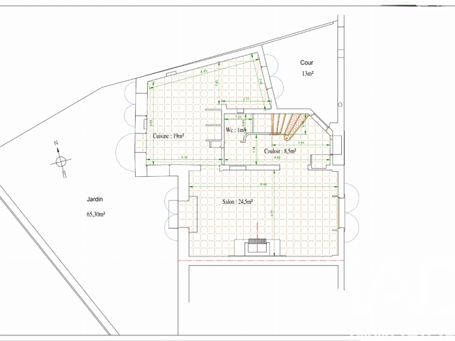 Elle se compose, au rez-de-chaussée, d’un salon avec cheminée traversant est-ouest, d’une spacieuse cuisine séparée et d’un WC.