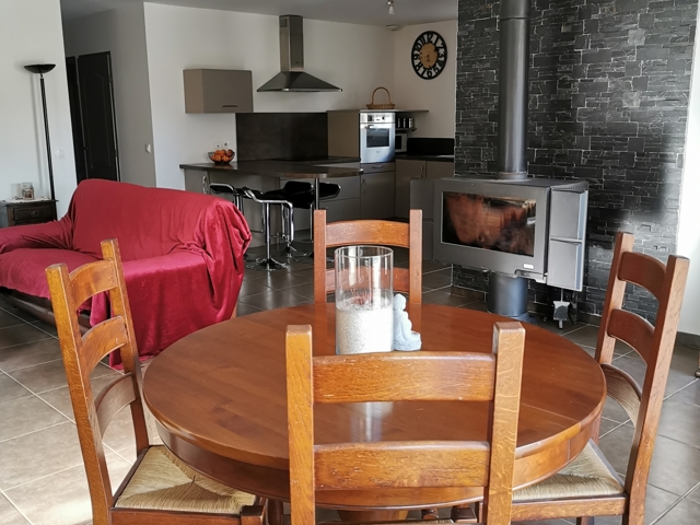 L'entrée s'ouvre sur une SPACIEUSE ET LUMINEUSE PIECE DE VIE DE 48m² comprenant la CUISINE aménagée et équipée ouverte sur le SALON et la SALLE-A-MANGER pourvue d'un poêle à bois de marque GODIN.