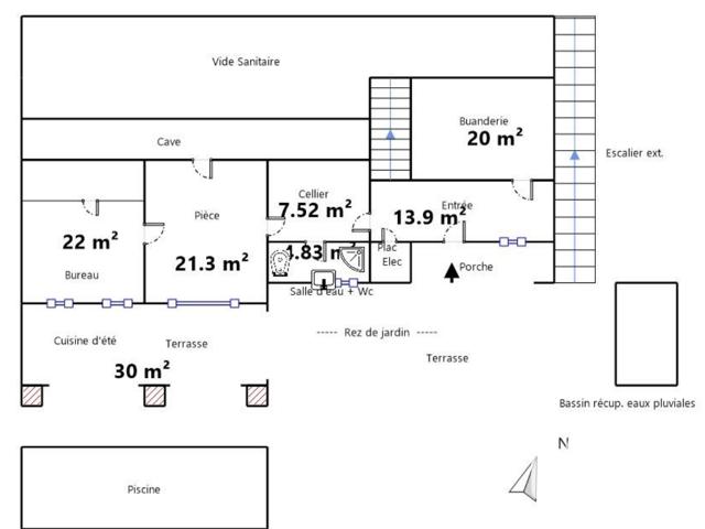 Le rez-de-chaussée propose une entrée spacieuse avec buanderie indépendante, desservant trois pièces communicantes, dont une pièce centrale largement ouverte sur l’extérieur grâce à de grandes baies vitrées. Cet espace donne accès à une terrasse couverte, une cuisine d’été et à la piscine. Une salle d’eau avec WC, une seconde salle d’eau, ainsi que deux caves complètent ce niveau, permettant l’aménagement d’un logement indépendant si souhaité.