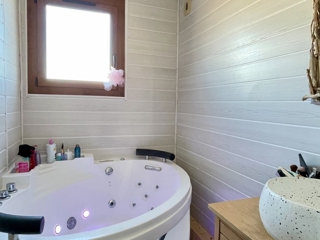 Nous trouvons une cuisine équipée et séparée, une salle de bain avec sa balnéo, un toilette séparé, deux grandes