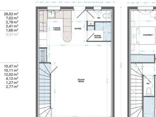 Développant environ 84,88 m² environ de surface de plancher, elle offre au rez-de-chaussée un bel espace de vie lumineux de plus de 28 m² environ, une cuisine ouverte, une entrée, un cellier/buanderie et un WC.
