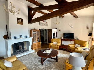 La maison principale s’organise autour d’un magnifique espace de vie d’environ 60 m², réunissant salon et cuisine dans une atmosphère chaleureuse sublimée par une belle hauteur sous plafond, des poutres apparentes et une cheminée.