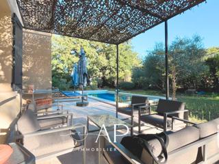Édifiée sur un terrain paysager, sublimé par une piscine , de vastes terrasses, un terrain de pétanque et des espaces de détente ombragés, la propriété invite à savourer pleinement l’art de vivre méditerranéen.