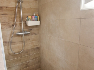 La salle d’eau moderne est équipée d’une douche à l’italienne, d'une vasque, d'un placard et d'un WC.