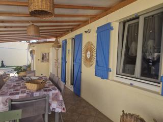 Une grande terrasse couverte pour les repas en extérieur, un espace détente et bains de soleil, deux coins salon de jardin, dont un abrité, une piscine semi-enterrée. La terrasse à l’avant de la maison, apporte un espace supplémentaire appréciable.